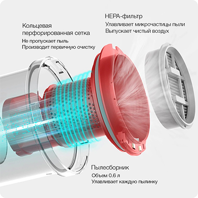 С помощью уникального циклонного фильтра высокой производительности пылесос Deerma эффективно удаляет из воздуха пыль и грязь, которая остаётся на дне пылесборника, а более тонкая фильтрация осуществляется с использованием HEPA-фильтра, удаляющего из воздуха даже мельчайшие частицы.