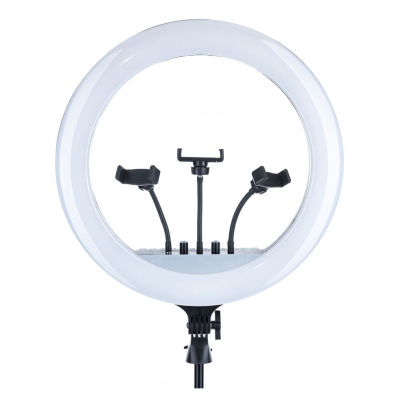 Кольцевая лампа AMAI RL-18 с держателем для смартфона предназначена для настройки правильного света при проведении фотосессий, организации рабочего места визажиста стилиста при проведении макияжа, прическа и т.д. Основным преимуществом кольцевой лампы AMAI RL-18 является отсутствие бликов и равномерное рассеивание света. Каждый специалист, в первую очередь, в этой кольцевой лампе, отметит возможность регулирования цветовой температуры и индекса цветопередачи, что в свою очередь делает ее более привлекательной для многих высококвалифицированных специалистов в различных областях, где требуется высококачественный свет. Естественно, при желании этот продукт можно приобрести не только в профессиональных целях, но и для домашнего использования, поскольку он имеет небольшой вес и компактность. Кольцевая лампа AMAI RL-18 оснащена большим количеством лампочек и станет незаменимой как для домашнего использования, так и для осуществления собственной профессиональной деятельности в любой отрасли. В комплекте предусмотрены 3 держателя смартфонов на гибкой стойке с шаровой головкой. Держатели подходит для смартфонов шириной от 6 см до 8,5 см. Светодиоды, в зависимости от выбранного режима, осветят ваше лицо мягко и аккуратно, либо подарят студийную подсветку, или же, дадут освещение, подобное ярким софитам. Кольцевая лампа с держателями для телефонов отлично подойдет для селфи. Режимы подсветки и яркости настраиваются с помощью поворотных ручек или с помощью пульта управления, идущего в комплекте. На задней панели лампы предусмотрены два USB разъема для питания установленных смартфонов. Диаметр внешнего кольца лампы 45 см, диаметр внутреннего кольца лампы 34 см, общая мощность до 55 Вт, цветовая температура регулируется в диапазоне 2700-6500K, источник света LED ламп, плавная регулировка яркости от 1% до 100%, НЕТ ультрафиолетового и инфракрасного излучения, низкая тепловая мощность, безопасность и защита окружающей среды, индекс цветопередачи - 90Ra.